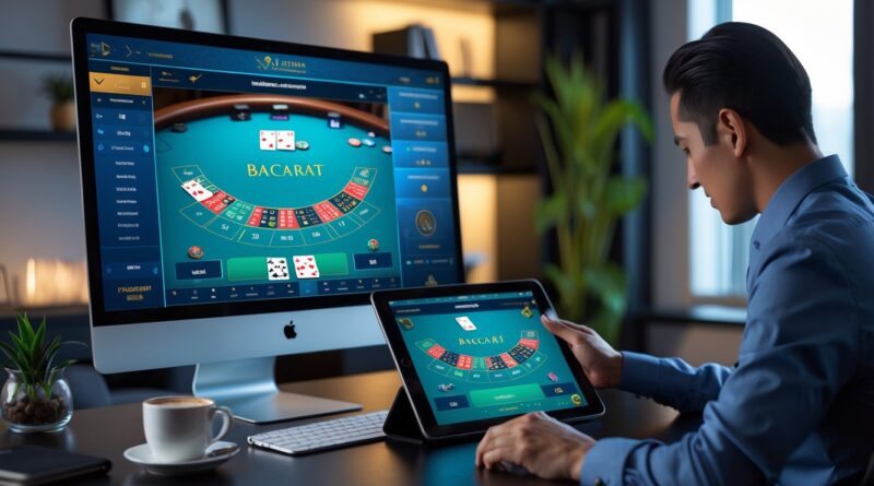 Seseorang menggunakan perangkat digital untuk bermain baccarat online dengan suasana modern dan teknologi canggih.